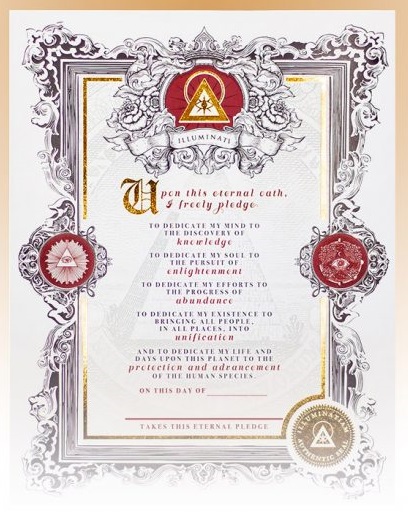 Since our origination, Illuminati members have dedicated themselves to the advancement of the human species by taking oaths of commitment. These pledges are a core tradition of the Illuminati, formed as written contracts between a single person and all members of humanity. The first pledge of the Illuminati is called the Eternal Oath.